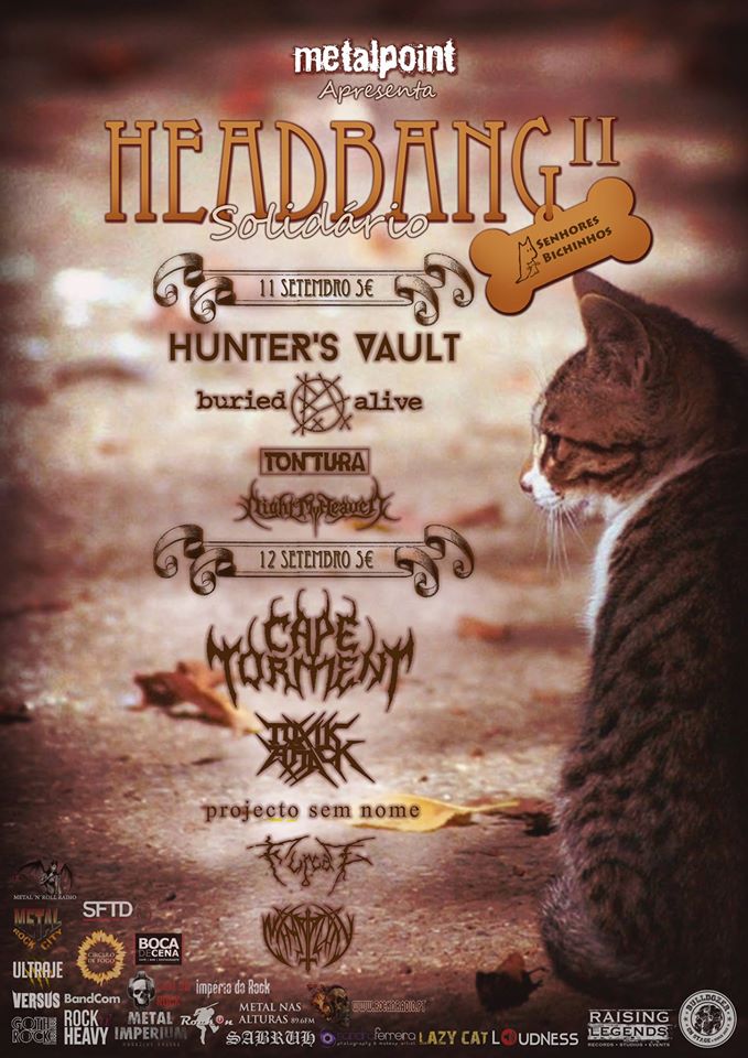“Headbang solidário – Senhores Bichinhos” é um evento que vai decorrer neste fim de semana a 11 e 12 de Setembro no Metalpoint no Porto. Headbang Solidário é um “projecto (que) tem como finalidade a organização de eventos Metal/Rock ,para angariação de fundos para causas sociais (incluindo protecção ANIMAL) e divulgação das bandas nacionais.” A angariação de fundos deste evento reverto a favor da Associação Senhores Bichinhos.
